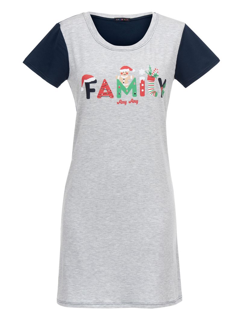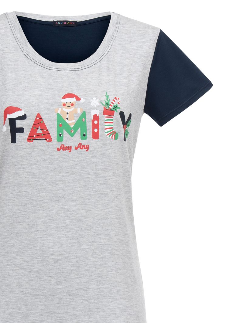 • Estampa temática com a palavra “Family” em silk, acompanhada de detalhes natalinos divertidos, como gorro do Papai Noel, luzinhas, enfeites, biscoito de gengibre e meia natalina;