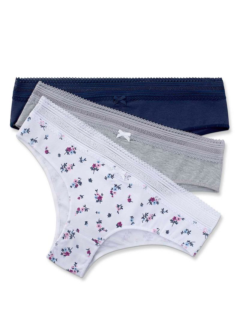 • Kit com três calcinhas, modelo boneca;