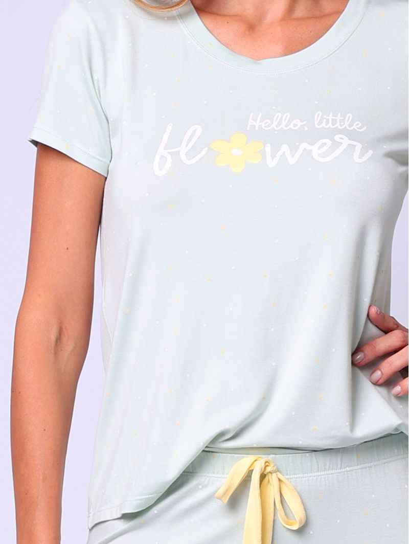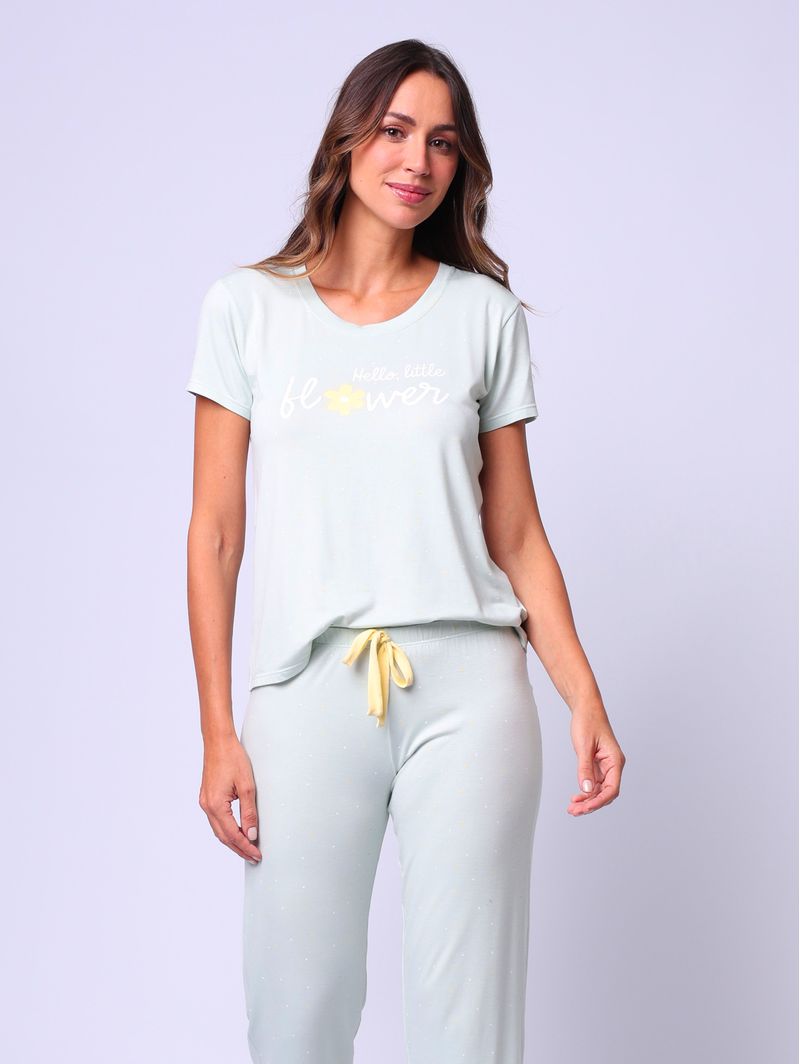 • Estampa frontal: silk com a frase “Hello, little flower”, trazendo um detalhe especial com uma flor substituindo a letra “O”, deixando o look ainda mais delicado;