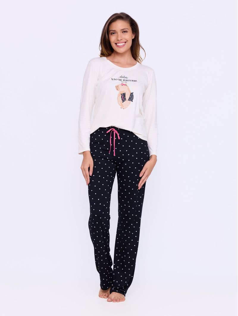 • Estampa frontal com frase "Status: Não me Perturbe" e desenho de capivara pronta para dormir - com detalhe de travesseiro com a mesma estampa presente na calça;