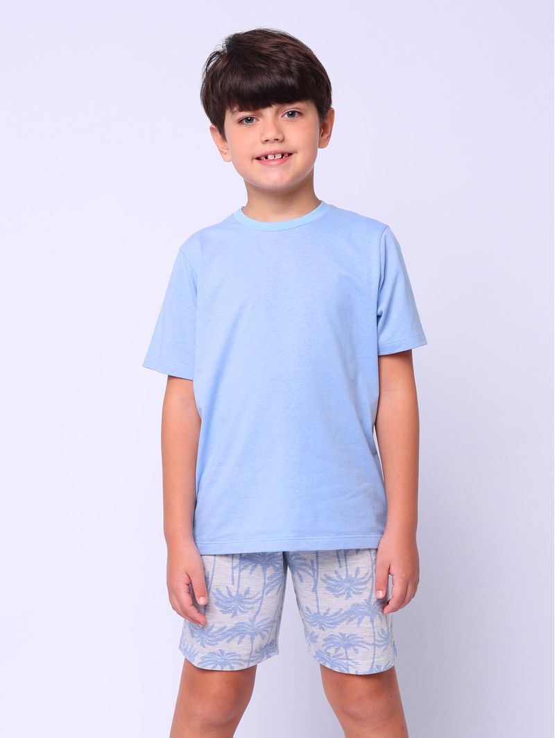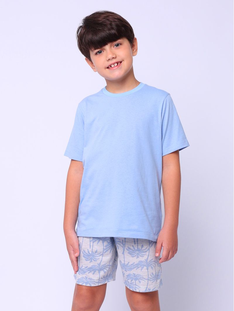 • Blusa: de manga curta e gola redonda, com acabamento na contra gola em estampa de palmeiras, combinando com a bermuda e criando um visual moderno e descontraído;