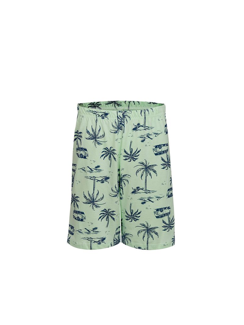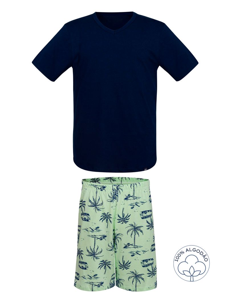 • Short em tom de verde, com estampa temática que remete à praia, trazendo um ar descontraído e moderno ao conjunto;