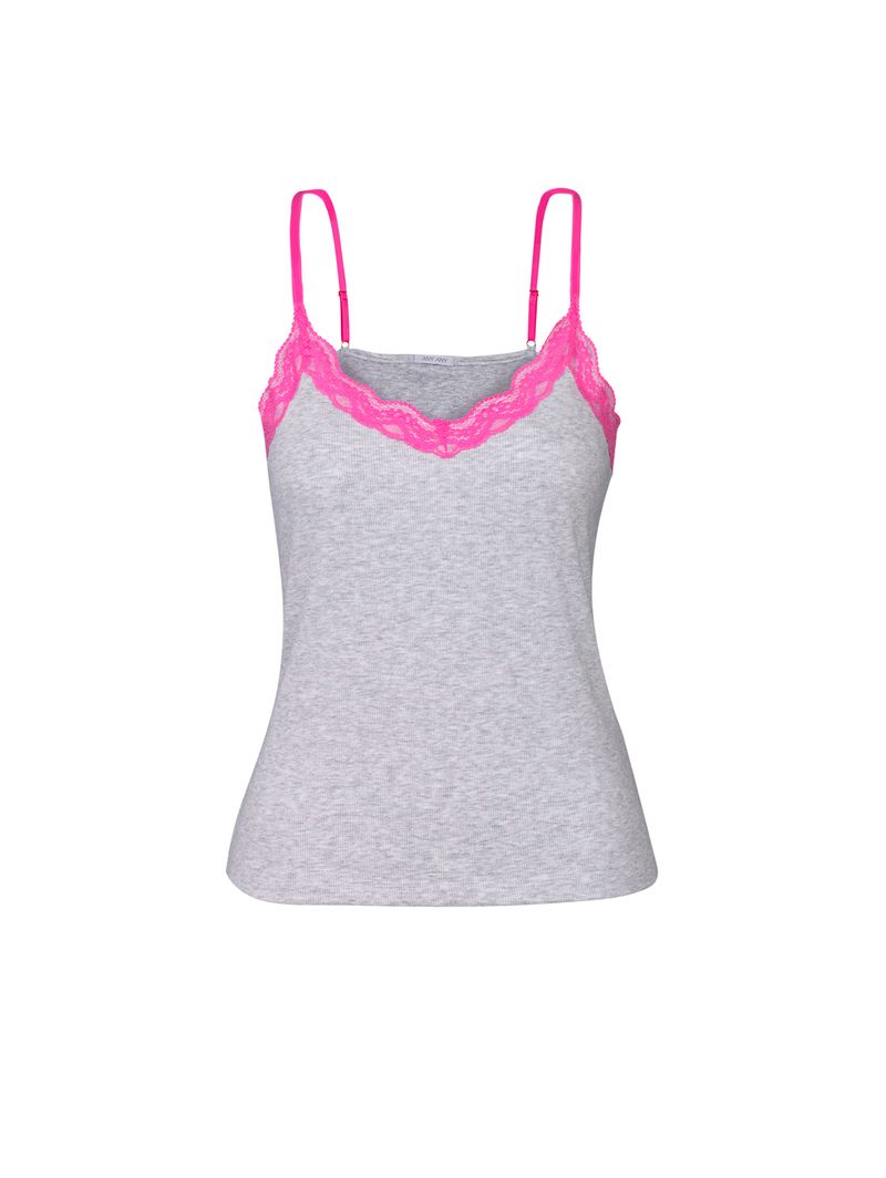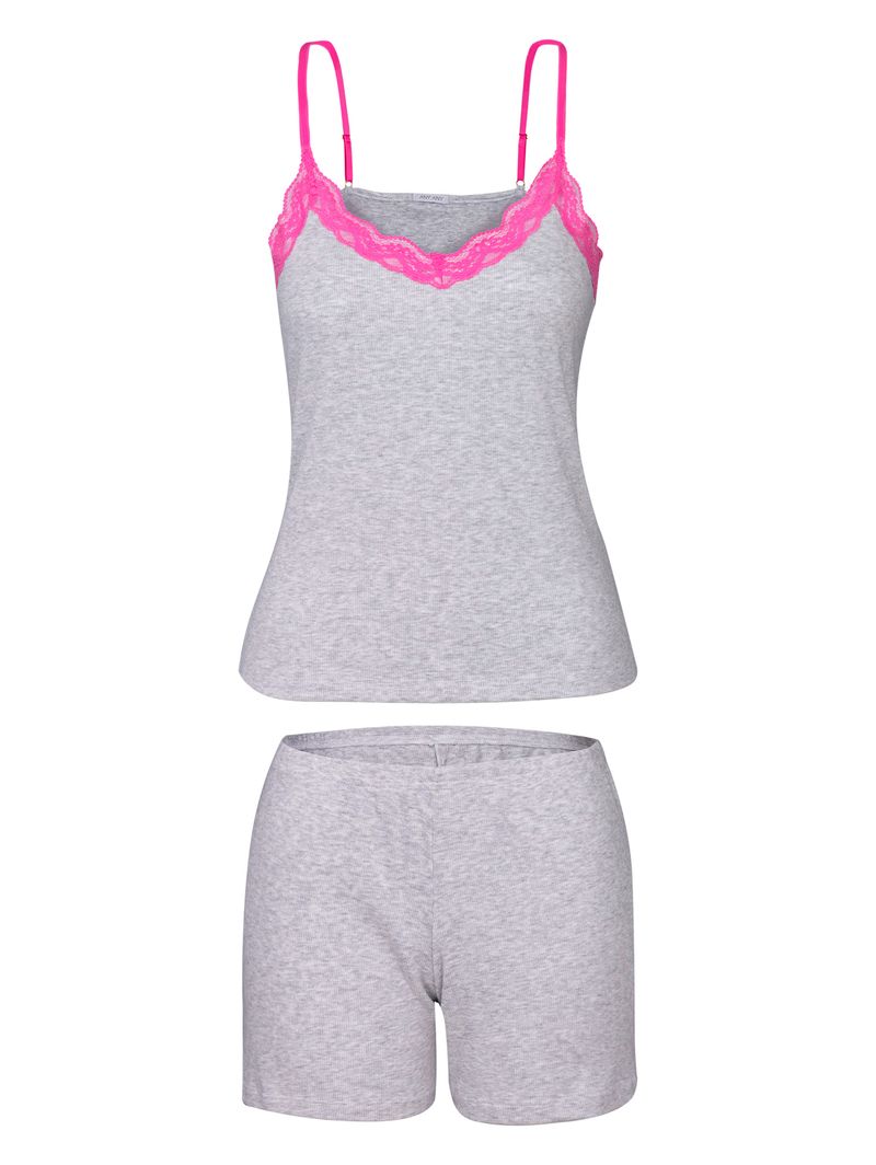• Decote: em V, valorizado por delicado acabamento em renda contrastante;