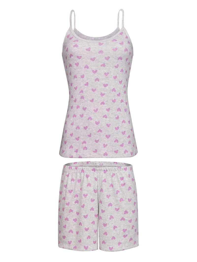 • Estampa: padrão de pequenos corações por toda a peça, adicionando um ar romântico e delicado ao conjunto;
