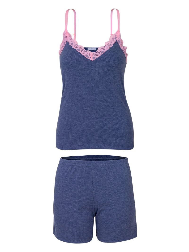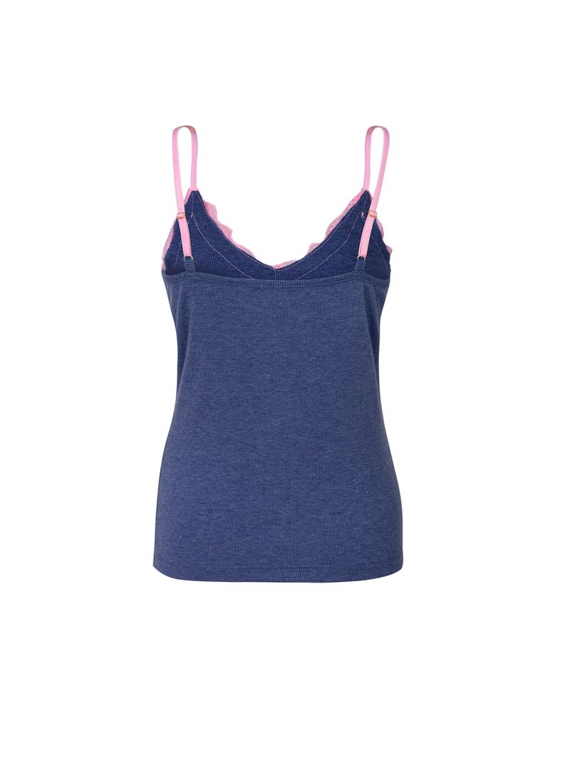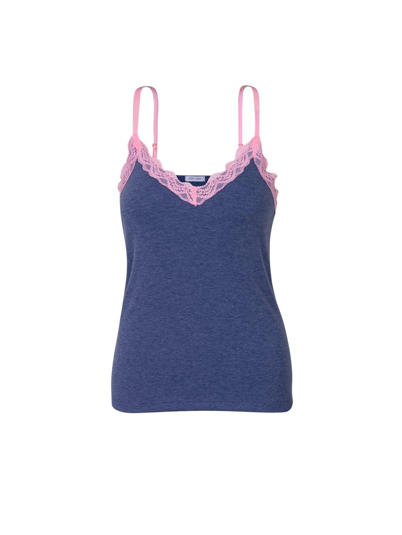 • Decote em V com aplicação de renda rosa, que contrasta com o azul marinho e adiciona um toque romântico à peça;