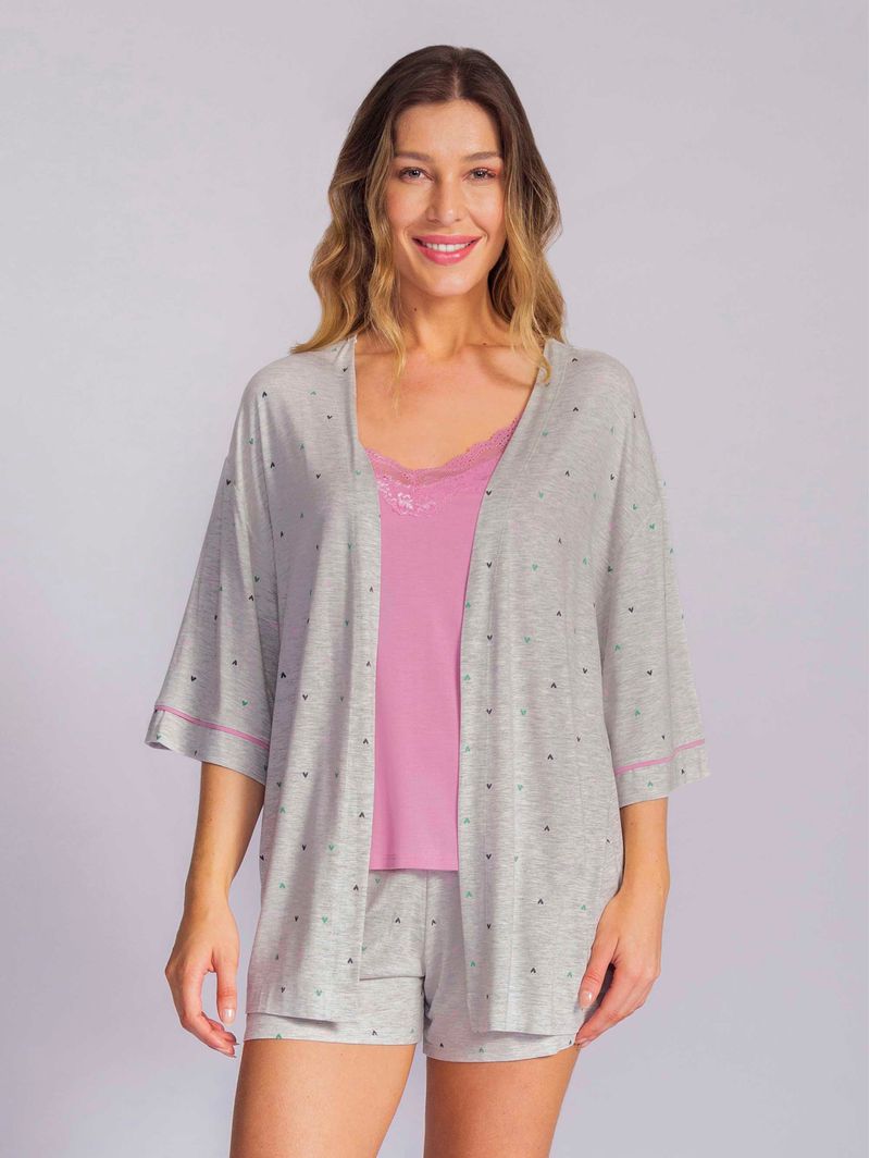 • Kimono e Shorts com estampa de mini corações coloridos, uma combinação romântica e cheia de personalidade;