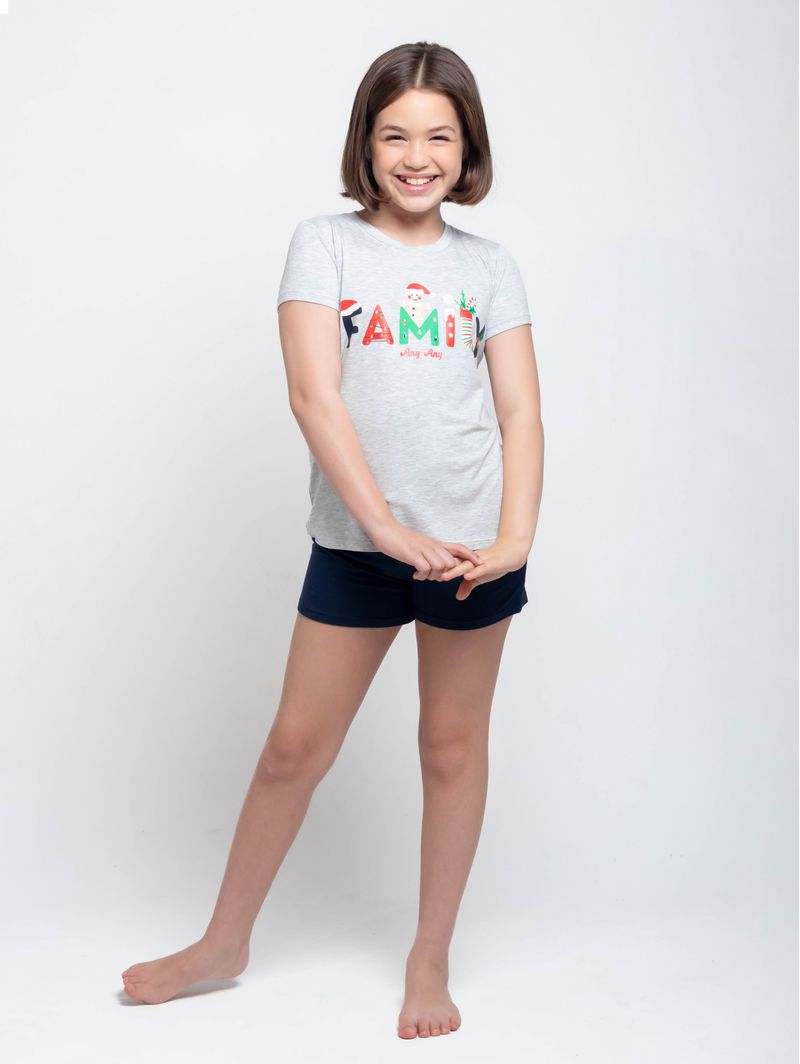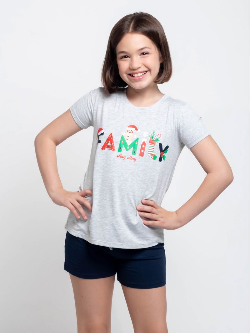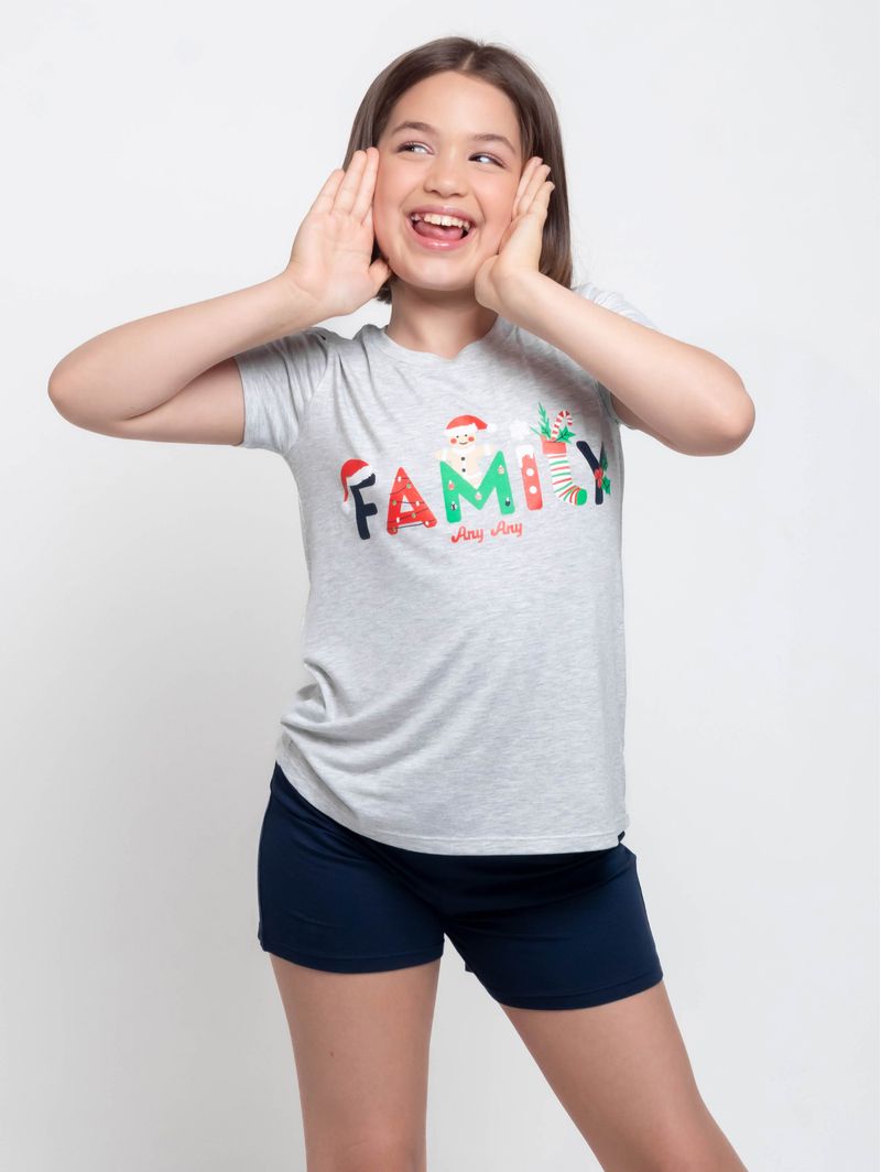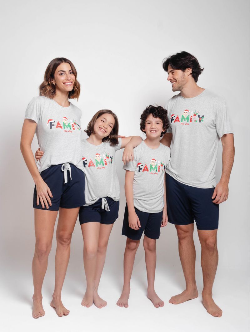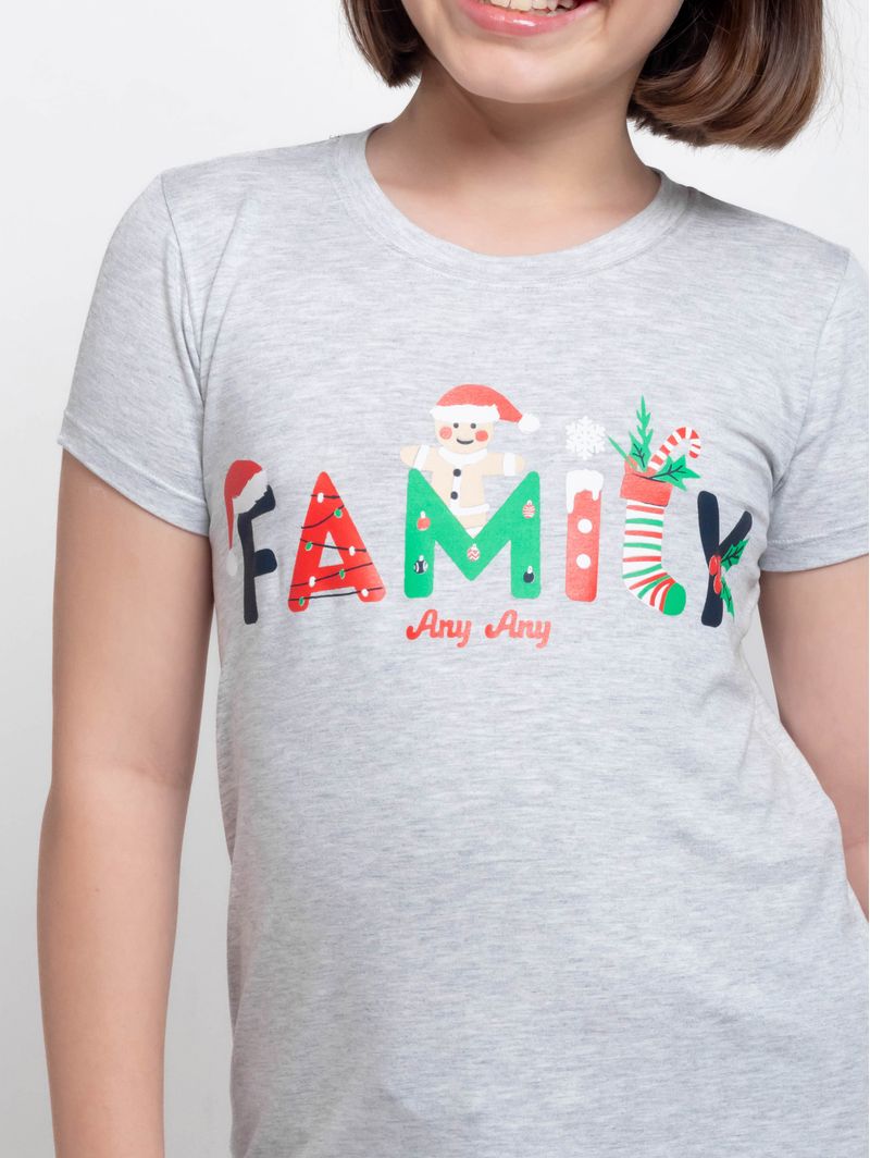• Estampa Silk: Palavra "Family" com desenhos fofos representando o Natal, como o gorro do Papai Noel, pisca-pisca, enfeites de árvore de Natal, biscoito, vela e meia de Natal;