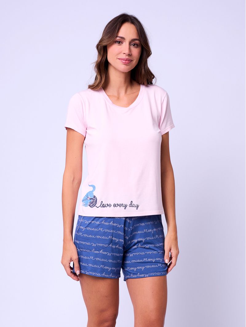 • Short: em tom de azul com estampa corrida de pequenos gatinhos e a palavra “miau”, compondo um visual divertido e cheio de personalidade;