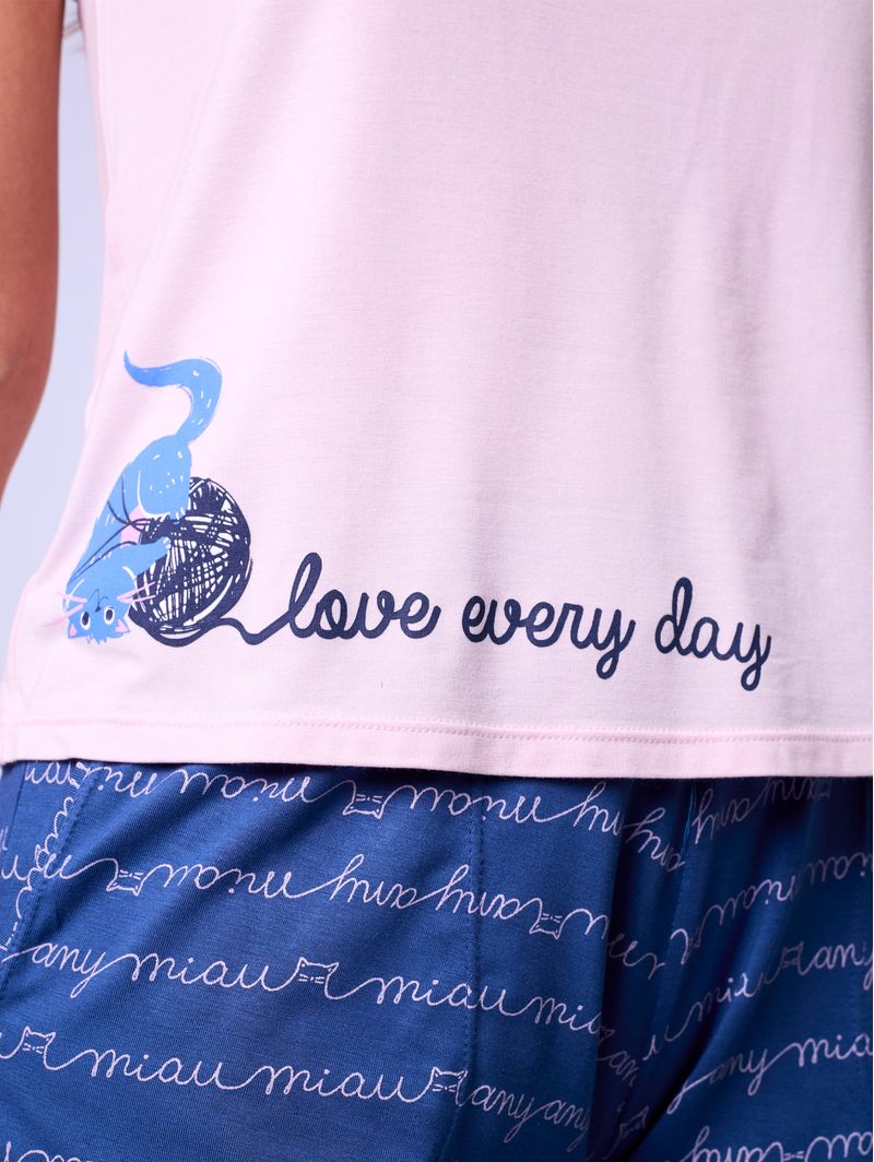 • Estampa: gatinho brincando com um novelo de lã e a frase “Love every day” (Ame todos os dias) aplicada no canto inferior, trazendo um toque de ternura e leve descontração;